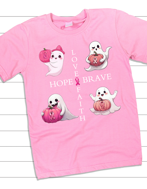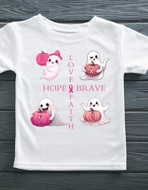 Celebrate strength, courage, and hope with our Breast Cancer Awareness Ghost Tee, available in white or pink. This playful yet powerful design features four adorable ghosts holding pink pumpkins, each marked with the iconic breast cancer ribbon. Surrounding them are the uplifting words: LOVE, HOPE, FAITH, BRAVE — a tribute to the warriors and survivors of breast cancer.