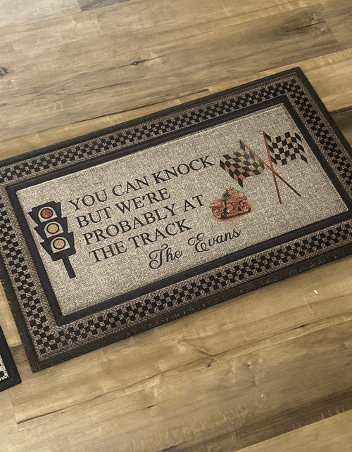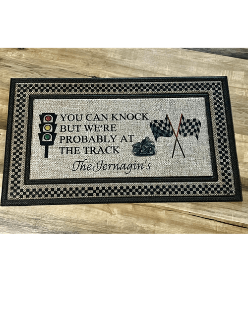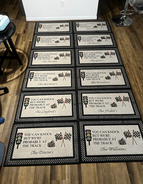 Elevate your entryway with the Race Track Custom Floor Mat, designed for car enthusiasts and families who love personalized décor. Available in grey or brown, this premium mat features the bold phrase: